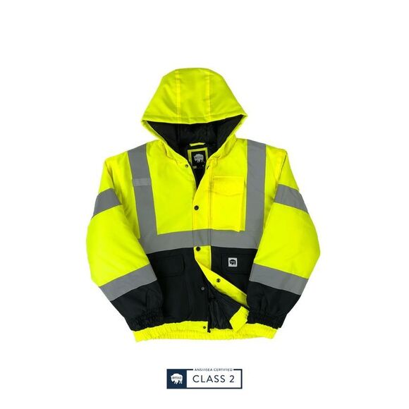 Keep warm and stay safe with our Buffalo Outdoors® Class 2 Hi Vis Winter Jacket. This outer layer comes equipped with a front left chest cellphone pocket, accessory loop, and utility pockets. Reflective striping on the front, back, and sides keep you visible from all angles.