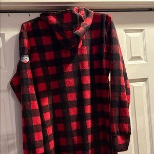 Stay cozy in this stylish, unisex red and black plaid hooded onesie. Perfect for lounging or a casual day at home.