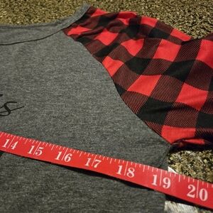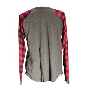 Buffalo Plaid Red & Black Sleeves Gray Shell Holiday Long Sleeve Tee Women M