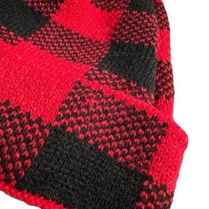 A cozy, season-perfect plaid hat. In a bold red and black plaid pattern. Warm and versatile. The perfect finishing touch.