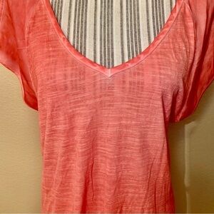 Lovely Coral Color with a V-Neck. Semi-Sheer and Short-Sleeved Shirt.