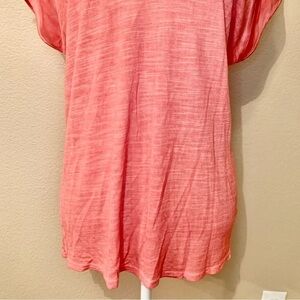 Lovely Coral Color with a V-Neck.  Semi-Sheer and Short-Sleeved Shirt.