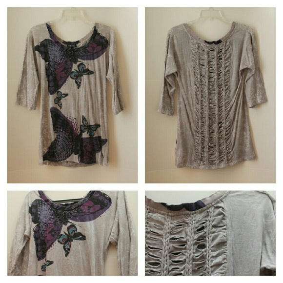 Butterfly graphic tshirt. 3/4 sleeve. Scoop neck. Cut and braided cut design on back. Also beaded accent on front.