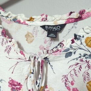 Elegant floral blouse by Buffalo David Bitton. Features a white base with pink and yellow flowers. Ideal for casual wear.