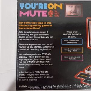 Get some face time in this hilarious guessing game of bad connections! Jump on-screen and connect with your teammates to guess as many keywords as you can. Players take turns being ?On-Screen? giving clues to their teammates- a literal screen that magnifies your mouth! Each game uses the same key words for all three rounds. Play from a STRONG SIGNAL- where players can say anything when giving clues, to WEAK CONNECTIONS- where they can only use one-word clues. Finally, in the last round YOU’RE ON MUTE and must mouth the key words while zoomed in on screen for all to see.