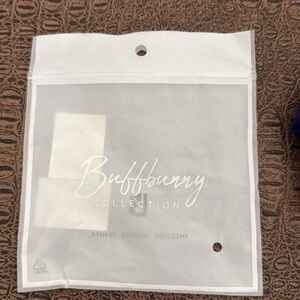 Buffbunny Collection scrunchie in midnight navy blue, brand new with tags, soft stretch fabric, durable elastic for comfortable hold, perfect for gym, workouts, everyday styling, or casual wear, includes original Buffbunny pouch, 74% nylon 26% spandex, machine washable, women’s accessory, hair scrunchie, activewear core, athleisure core, casual core.