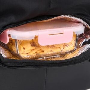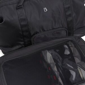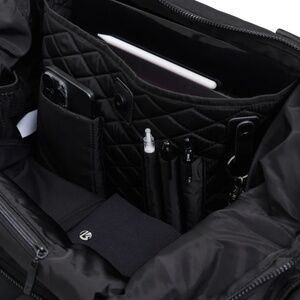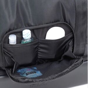 This duffle is made with a water-resistant & exterior and interior. It has two carrying straps and an exterior sleeve that slips over most telescopic luggage handles for easy travel! The main compartment features a quilted laptop sleeve with a snap button closure, 2 mesh drink holders, cord organizer, pen holders, and card holders! It also has an insulated food storage compartment with interior snaps to collapse and compress when not in use. For extra storage, it has a detachable bottom compartment made with a vegan leather.