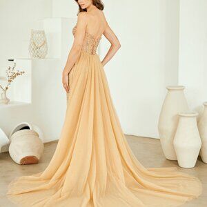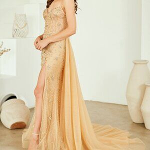 The Buffy gown is a show-stopping masterpiece designed to sparkle all night. Featuring a strapless sweetheart neckline and sheer corset bodice, it’s covered in dazzling beadwork and sequins that catch the light with every move. A thigh-high slit adds bold allure, while the flowing train brings dramatic elegance. Glamorous, radiant, and unforgettable.