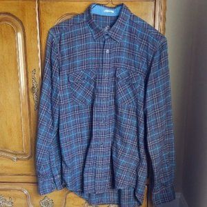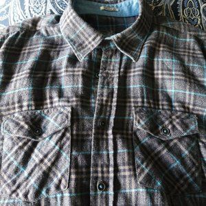 Shaped fit, long-sleeved shirt in 100% cotton flannel, plaid check with point collar and two button-flap patch pockets, full button placket, two-button cuffs and curved hem. Vibrant colors of gray, black and teal. Extra buttons included on board.