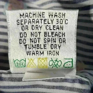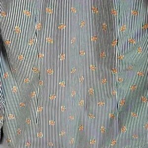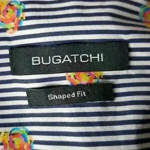 This shirt by Bugatchi is in excellent used condition. It features a dark navy blue and white striped with multi-color roses print. "Shaped Fit" style has 2 back darts. Long sleeves with adjustable cuffs. collar has sewn in stays.