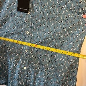 This is a Bugatchi Uomo men's button-up shirt in size Large, with long sleeves and a blue color. The design features a butterfly print, making it a unique and stylish piece. It is made of cotton material and is brand new with tags.