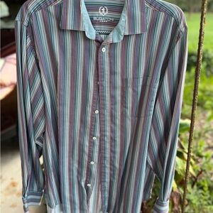 You are purchasing a Vibrant Bugatchi shirt with multicolor stripes. Features a classic collar and embroidered logo. This is a classy shirt that will make you stand out in the crowd.