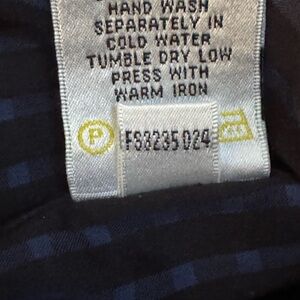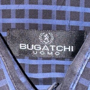 Stylish Bugatchi shirt with a navy checkered pattern. Features a classic collar and button-up front. Perfect for any occasion.