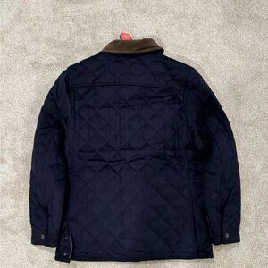 This diamond quilted field jacket, crafted from wool and cashmere, blends functionality and timeless appeal. It features a fully quilted nylon lining for warmth, a two-way zipper, a covered placket with snaps for added protection, adjustable cuffs and adjustable side vents for enhanced mobility. Classic details include a corduroy collar and multiple utility pockets.