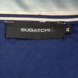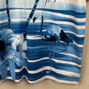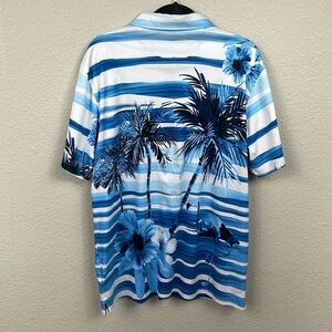 Stay cool and stylish in this Bugatchi polo shirt, size XL. The vibrant blue and white watercolor stripes are perfectly complemented by a tropical print of palm trees, flowers, and flamingoes. The shirt features a classic collar, buttoned placket, and a comfortable fit. Add a touch of paradise to your wardrobe with this unique and eye-catching piece!