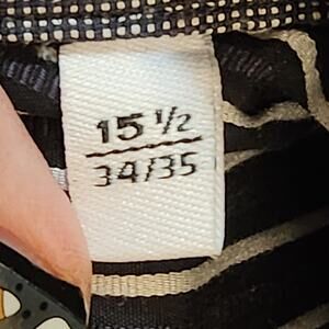 This Bugatchi black & white button-up dress shirt is in excellent pre-owned condition with no stains or flaws. Made of 100% cotton. See photos for measurements, fabric content, and care. Size 15.5, 34/35