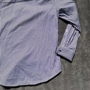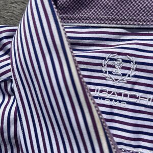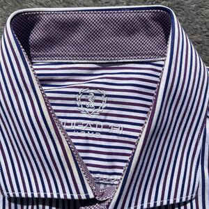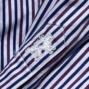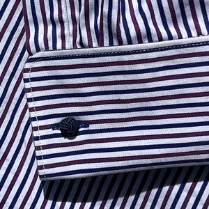 Elevate your casual style with this Bugatchi Uomo dress shirt in a stunning shade of purple. The shirt features a striped pattern, long sleeves with French cuffs, and a collared neckline with a spread collar style. The button-up closure and accents like flip cuffs and buttons add a touch of modern elegance to the shirt.