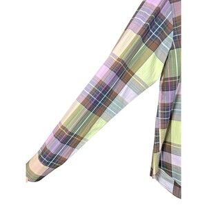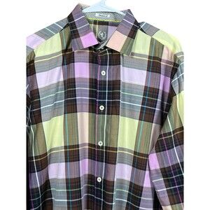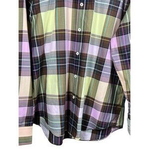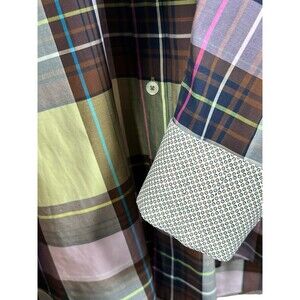 Luxury designer button-front in bold multicolor plaid (brown, lilac, green, pink). Contrast cuff lining. Shaped fit. 100% cotton. Excellent condition.