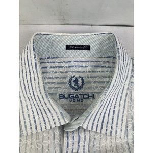 Bugatchi Uomo Mens Large Classic Fit Long Sleeve Flip Cuff Button Up Down Lg Condition is pre owned Size large Has a small stain in the front please see pictures Shoulder seam to end of sleeve 26 Under arm to bottom end of shirt 17 Chest under arm to under arm 24 Back collar seam to bottom end of shirt 32 If you have any questions please feel free to ask Please feel free to look at what else we have in our store. Thank you for browsing.