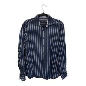 Bugatchi Uomo Mens Medium Long Sleeve Button Up All Cotton Blue White Stripe Flower Collar