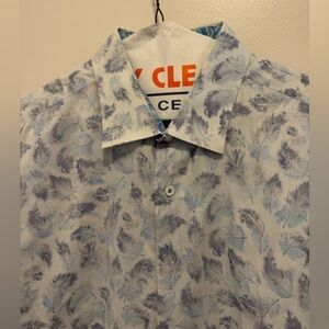 Stylish Bugatchi shirt with a feather print. Light blue and white colors. Perfect for casual outings.