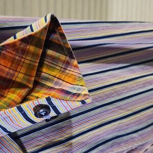Sharp and stylish Bugatchi Uomo men’s dress shirt with a bold multicolor vertical stripe pattern in shades of blue, purple, pink, and yellow. Designed with a classic button-down front, long sleeves, and a single chest pocket. Known for their high-quality fabrics and European-inspired style, Bugatchi shirts are perfect for work, events, or smart-casual wear.