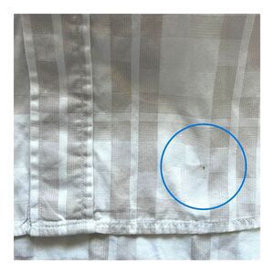 Small pinhole size dot at the bottom hem of shirt, and stain on inside back of the collar. Please review photos for details, condition and measurements.
