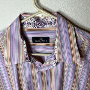 Bugatchi Uomo Striped Pink Multi Color Size XL Shirt. The size tag is missing but looks to be an XL size. The shirt is in excellent condition. No signs of wear or markings.