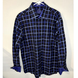 Bugatchi Windowpane Check Shaped Fit Long Sleeve Button Down Shirt Black/Blue XL