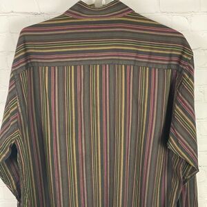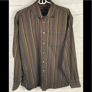 Bugatchi Long Sleeve Button Up Shirt. Shirt is brown with multi colored stripes. Size M in EUC. A-004