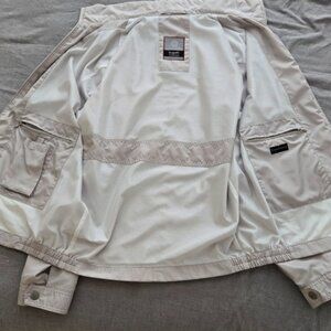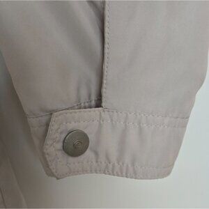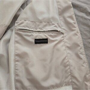 Medium sized, tan / taupe colored casual jacket by Bugatti The European Brand. water repellant, lightweight and contemporary but timeless style. EUC. The interior is immaculate and the outside has no stains or discolouration.