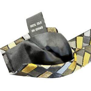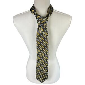 Details: Classic Pointed Tie with Geometric, Block Check Pattern in Bluish Gray and Gold Tan. Tie Keeper Loop and Logo.