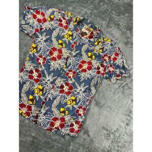 Featuring a vibrant blue and red floral print, this men's size large shirt is perfect for casual outings or adding a touch of flair to your everyday look.