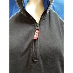 The shirt is machine washable and has a dark fabric wash. It has a solid pattern with a blue and black color. The shirt's accents are a zipper, and it has long casual sleeves. The shirt also has a 77 tracking system logo and is perfect for casual occasions like athleisure.