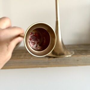 Solid brass set of 3 candlesticks bugle style. Heavy and nice quality. Each stick has a different style. One is straight, one round and one long oval. Slight patina present. There are a few small nicks as shown in the photos. Candle wax debris in the cups. The heights are slightly graduated. Vintage set. I have seen a lot of brass candlesticks but never a set like this. Very unique. Would be perfect set out for the holidays or in a musicians home!