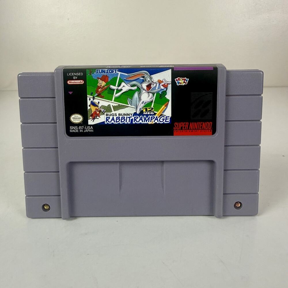 "Bugs Bunny Rabbit Rampage" is a platformer video game published by Sunsoft for the Super Nintendo console. It features E - Everyone rating and is part of the Bugs Bunny series. Players control Bugs Bunny as he navigates through various levels, collecting carrots and avoiding enemies. With its fun gameplay and charming graphics, Bugs Bunny Rabbit Rampage is a classic title that offers hours of entertainment for players of all ages.