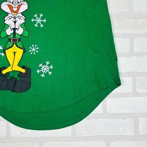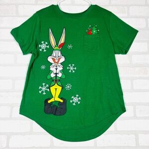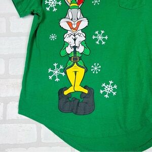 Bugs Bunny as Buddy The Elf Green Short Sleeve Pocketed T-shirt Juniors XL 15-17. Get ready for the holidays with this festive Looney Tunes Bugs Bunny Elf Christmas Snowflakes Graphic T-Shirt! This fun and colorful shirt features Bugs Bunny dressed as an elf, complete with a red hat, green suit, and a mischievous grin. The shirt also features snowflakes and Christmas trees, making it the perfect addition to your holiday wardrobe. Whether you're attending a Christmas party or just want to spread some holiday cheer, this shirt is sure to make you stand out. Soft and comfortable: Made from high-quality materials. Fun and festive: Perfect for any holiday occasion. 20.5” chest, 26.5” length. #828 4.7