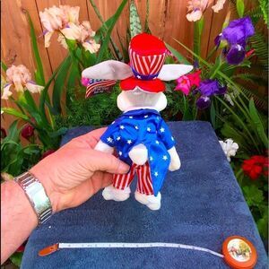 Exceptional plush toy, probably one of my most favorites out of all the hundreds of plushes and Ty BB’s I have. He’s in wonderful condition and his coat and hat are bright with the Stars and Stripes colors. Very unique…I’ve not come across one of these before!!