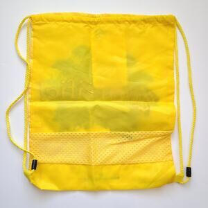 "Zoorrific" matching set of 2 working drawstring bags (one for child owner, one for plush) are a bright yellow, vinyl-type material. Large is 16.5" long x 13" wide. Small is 6.25" high x 4.25" wide. The only tag inside either says "Made in China," so I apologize I don't have additional details.