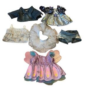 This Build-A-Bear clothes lot includes a butterfly dress, denim jacket, skirt, shorts, and tanktop, perfect for a 16-inch bear. The colorful multicolor clothing set is made of cloth material and features a girl-themed design. They are in very nice condition. Ideal for everyday wear or costume play, this original set from Build-A-Bear Workshop offers a variety of pieces to dress up your bear in a stylish and fun way. Whether you're looking for casual clothing or something for a special occasion, this lot has everything you need to outfit your furry friend.