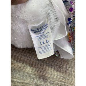 This delightful 17-inch stuffed animal bear is a perfect gift for any occasion. It features a shimmering white and silver color scheme with glittery pink accents and bows. The bear was manufactured in the 2000-2009 time period by Build-A-Bear Workshop, a trusted name in plush toys. It comes unboxed but with accessories and clothes, including a cute skirt. The bear is in its original, unaltered state and has been signed by Build-A-Bear Workshop itself.