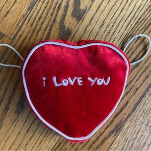 This red velvet heart-hugger pillow says "I Love You" in white embroidered letters! Retired from the Build-A-Bear Workshop, the heart-shaped pillow has elastic bands on each side for looping over your furry friend's arms. It measures approximately 4" x 4" x 1". Plush I love you Pillow with secret compartment to hide a small gift for the love of your life.