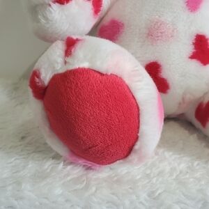 Perfect for your collection! Build A Bear Workshop Valentine Hearts Teddy Bear plush stuffed animal toy. BABW stuffed with hugs and good wishes. White fur covered with 3 colors of pink, red heart nose, velvet feel inside ears, nose and bottom of paws, pink plastic eyes, branded logo tag on side, filled with 100% polyester fiberfill. Made 11/2010. Approximately measures 16" long. Excellent quality and condition.