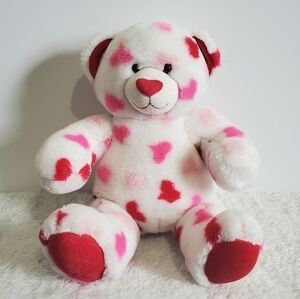 Perfect for your collection! Build A Bear Workshop Valentine Hearts Teddy Bear plush stuffed animal toy. BABW stuffed with hugs and good wishes. White fur covered with 3 colors of pink, red heart nose, velvet feel inside ears, nose and bottom of paws, pink plastic eyes, branded logo tag on side, filled with 100% polyester fiberfill. Made 11/2010. Approximately measures 16" long. Excellent quality and condition.
