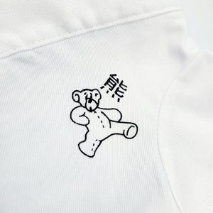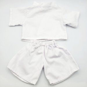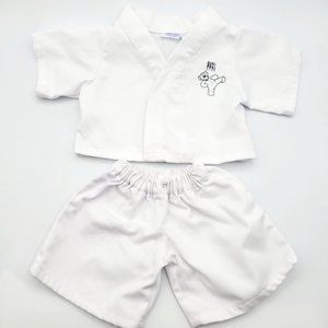 This Build a Bear (BABW) lot includes 1 cream colored Build a Bear teddy bear with a brown felt nose, wearing 1 white karate outfit (karate gi).