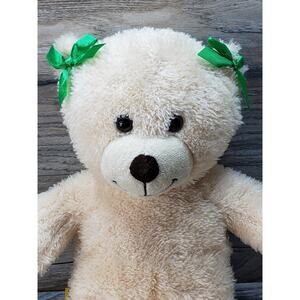 Build A Bear Workshop Cream Teddy Plush Stuffed Animal With Green Bows. Condition is used, good clean condition, Measurements are 16" Long, Weight is 10.3oz.