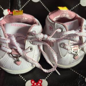 1 pair Sketchers, croc like, clear glass slipper & white pattern leather