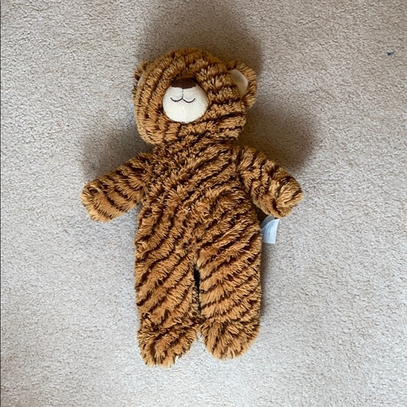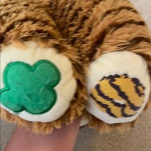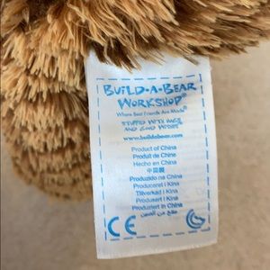 This is a orange and brown build a bear. It is very soft. The paws have designs on them. It has brown and green eyes.