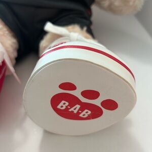 This bear is in excellent condition . He has on a black, red & white jersey. He has red & white sneakers. He stands 18” high