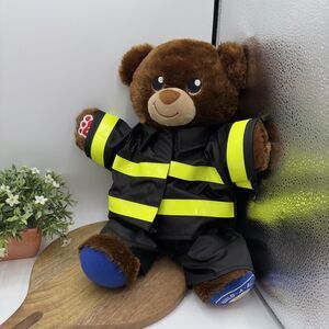 The product is a 15-inch preowned Build-A-Bear plush bear from the National Teddy Bear Day collection in 2018. This brown bear comes with a fireman outfit and is part of the Build-A-Bear Workshop brand. It is an original, plush bear with black eyes, making it suitable for all occasions. This bear is a part of the 2010-2019 time period and is perfect for children who enjoy collecting teddy bears and playing with stuffed animals.